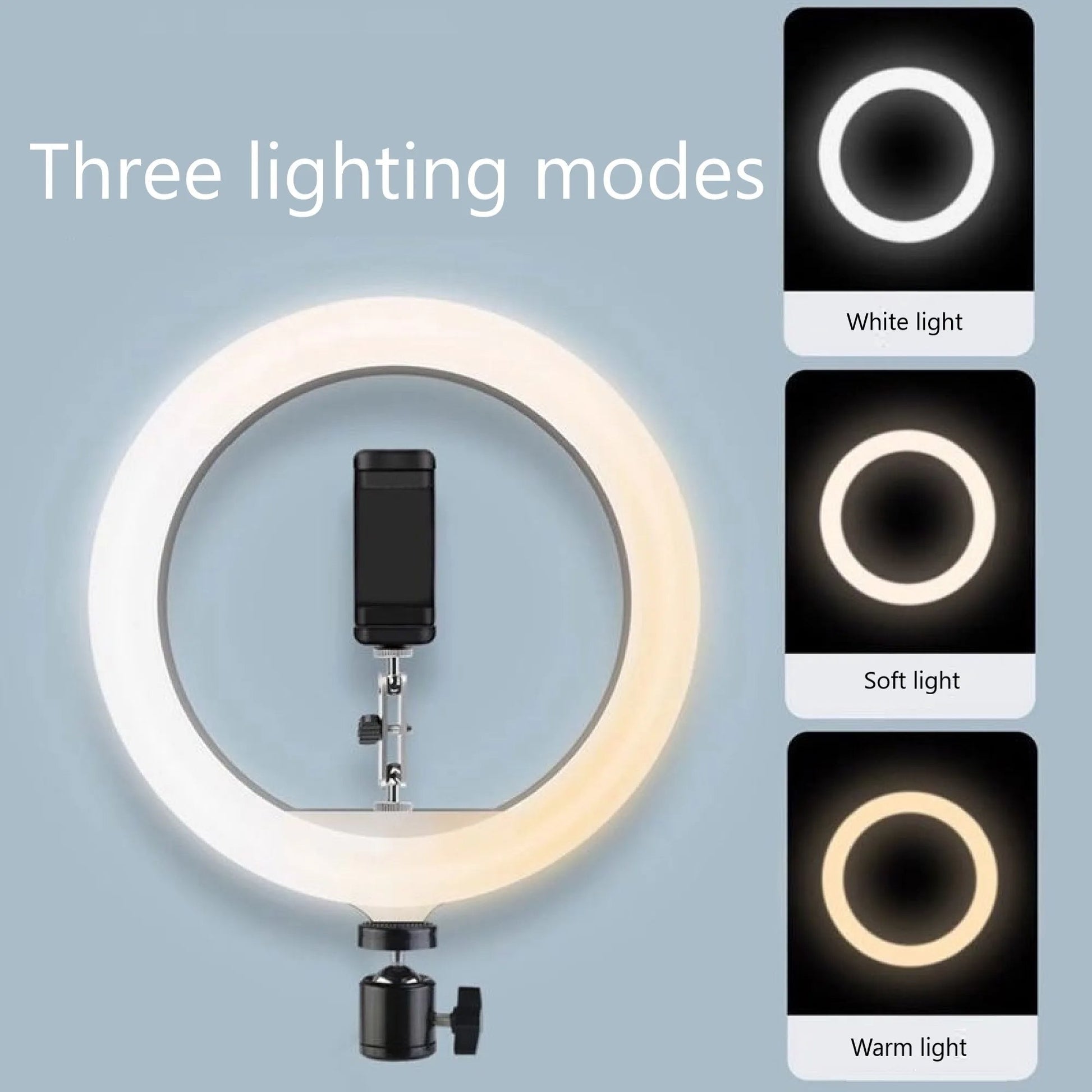 10”26CM Selfie LED Ring Light Photo Studio Photography Dimmable W/ Tripod Stand & Phone Holder Feature: 3 Light Modes 10" Ring Light The led ring light is with 3 light modes & 10 adjustable brightness for your choose, meet all your needs in different circumstances. 3 light modes: white, warm yellow, warm yellow + white.