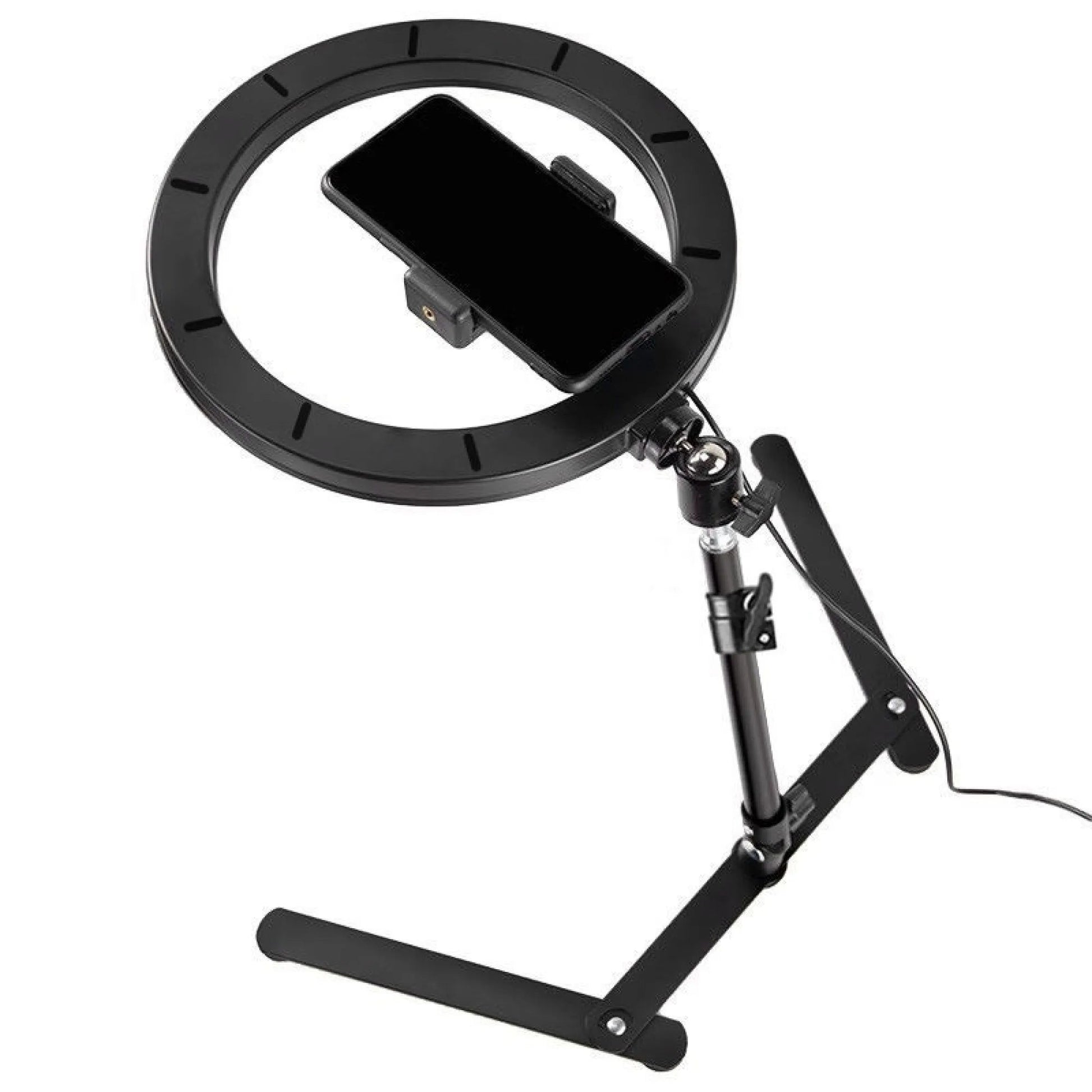 Work As a Table Lamp This ring light can be worked as a table lamp for your makeup or other online teaching that you should finish on the desk. It also work perfectly as a desk night light for baby. 360° Rotation Angle for cell phone The cell phone holder height is adjustable, and it is 360 degree rotatable, adjustable viewing whether it may be horizontal, vertical, or any angle under the sun The 10 inch mini ring light is equipped with a cell phone holder that you can hold a 5.7cm to 8.5cm (2.24inch to 3.35inch) smartphone, providing shadowless and even lighting to help you look more beautiful.It's good idea for makeup,YouTube videos,wedding art,filling light 1. High quality LED equipment, no flicker, no light radiation, low heat output, safety and environmental protection. 2. Warm light, warm white light, white light switch, can adjust the brightness, adjust to the most appropriate brightness. 3. Suitable for most devices that support USB port, such as laptop, PC, mobile power supply, USB charger, AC adapter, etc. 4. Widely used in podcasting, live broadcast video, video chat, selfie lighting, makeup, indoor filling lights, portrait, fashion, wedding art, advertising photography, etc. Specification: Material: ABS+ aluminum alloy Lighting: warm and cold light Modes: three color light adjustment (can adjust brightness) Working temperature: less than 45℃, no hot hazard, safe to touch Note: Please allow 1-3mm differs due to manual measurement.